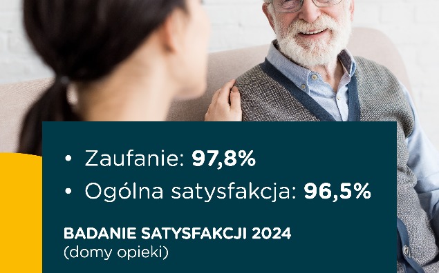Najnowsza edycja Badania satysfakcji, które co roku obejmuje mieszkańców domów opieki oraz Ich bliskich, przyniosła wzrosty w kluczowych obszarach - ZAUFANIE osiągnęło poziom 97,8%, a SATYSFAKCJA 96,5%. Ocena ogólna rośnie z roku na rok już od kilku lat. Tak wysoki poziom zadowolenia jest dla firmy powodem do dumy, a jego utrzymanie ogromnym zobowiązaniem i wyzwaniem dla wszystkich zespołów.