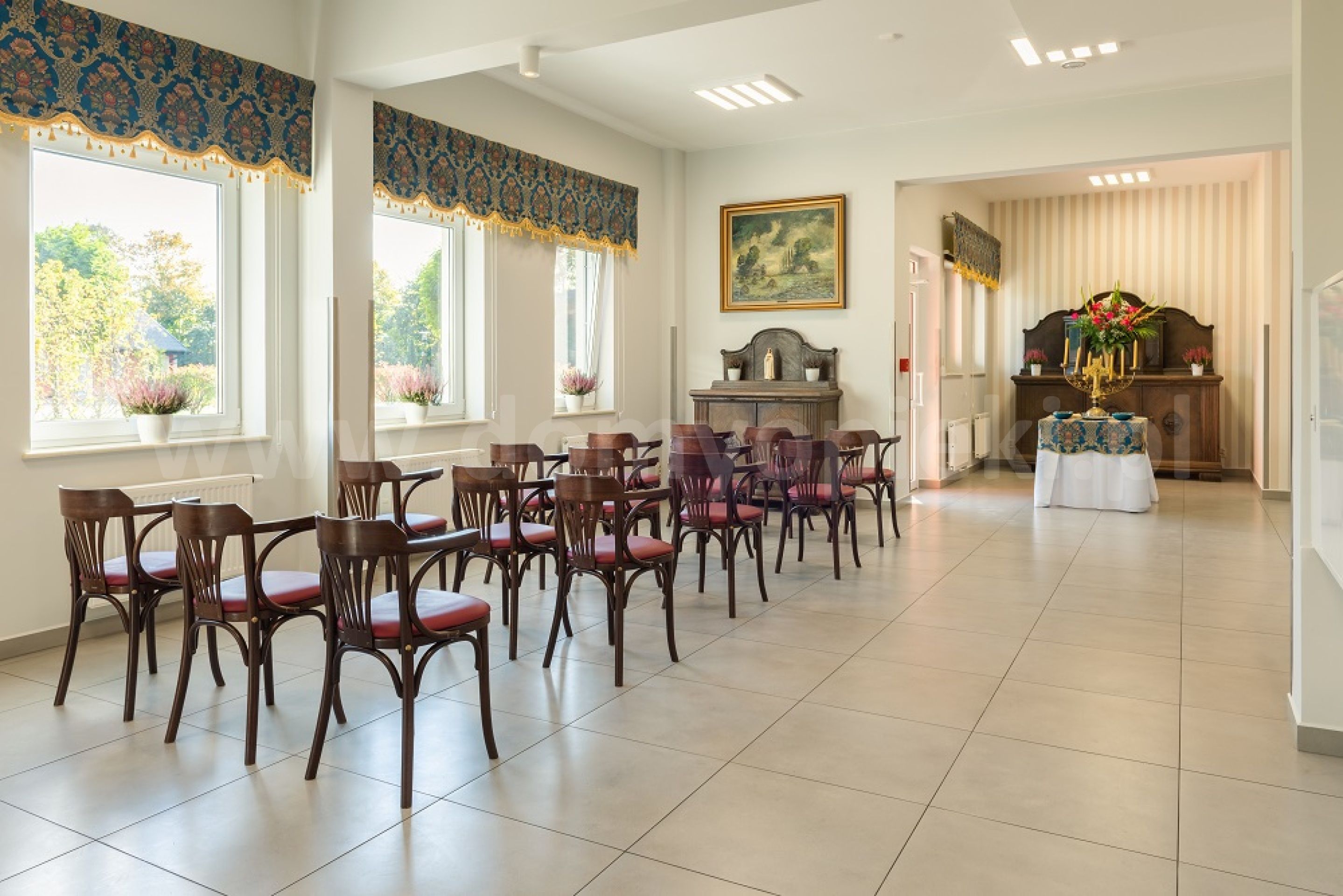 Na zewnątrz budynku – do dyspozycji Mieszkańców – jest duży ogród z kapliczką, fontanną, starodrzewem i ciągami komunikacyjnymi. Pensjonariusze Domu mają również do dyspozycji herbaciarnię oraz siłownię zewnętrzną, umożliwiającą prowadzenie indywidualnych i grupowych ćwiczeń ruchowych.