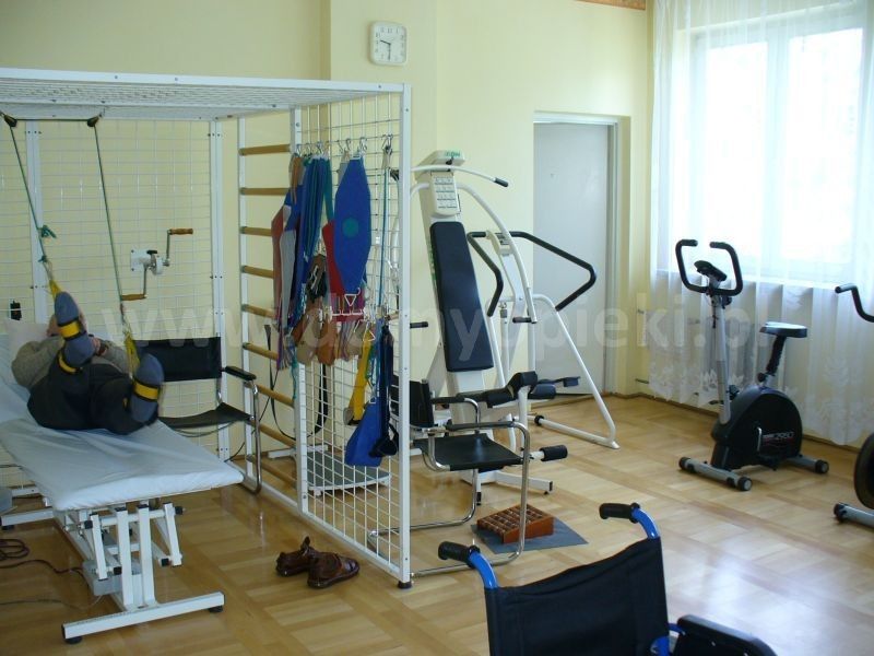 Gabinet rehabilitacji, gdzie prowadzona jest kinezyterapia, gimnastyka, fizykoterapia, światłolecznictwo, laseroterapia, elektroterapia, ultradźwięki, nebulizacja, parafinoterapia. Rehabilitacja ogólno usprawniająca prowadzona jest także w pokojach Mieszkańców.