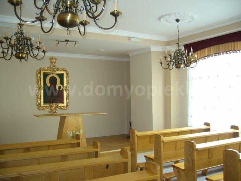 Budynek jest złożony z dwóch obiektów: budynek główny, mieszkalny i budynek socjalny. Oprócz części mieszkalnej posiada również kompleks rehabilitacyjny złożony z: dwóch sal gimnastycznych, gabinetów do prowadzenia zabiegów fizykoterapii, hydroterapii, masażu oraz terapii zajęciowej. W budynku socjalnym znajduje się kuchnia, jadalnia, pralnia i kaplica. Budynek otacza pięknie zagospodarowany ogród, gdzie ciągną się ścieżki spacerowe, stanowiące miejsce rekreacji dla mieszkańców.