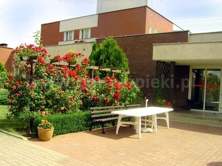 W otoczeniu Domu znajduje się teren zielony z trawnikami, krzewami, drzewami i kwiatami. System wewnętrznych alejek (pergole, ławki) sprzyja spacerom zapewnia kontakt z naturą.