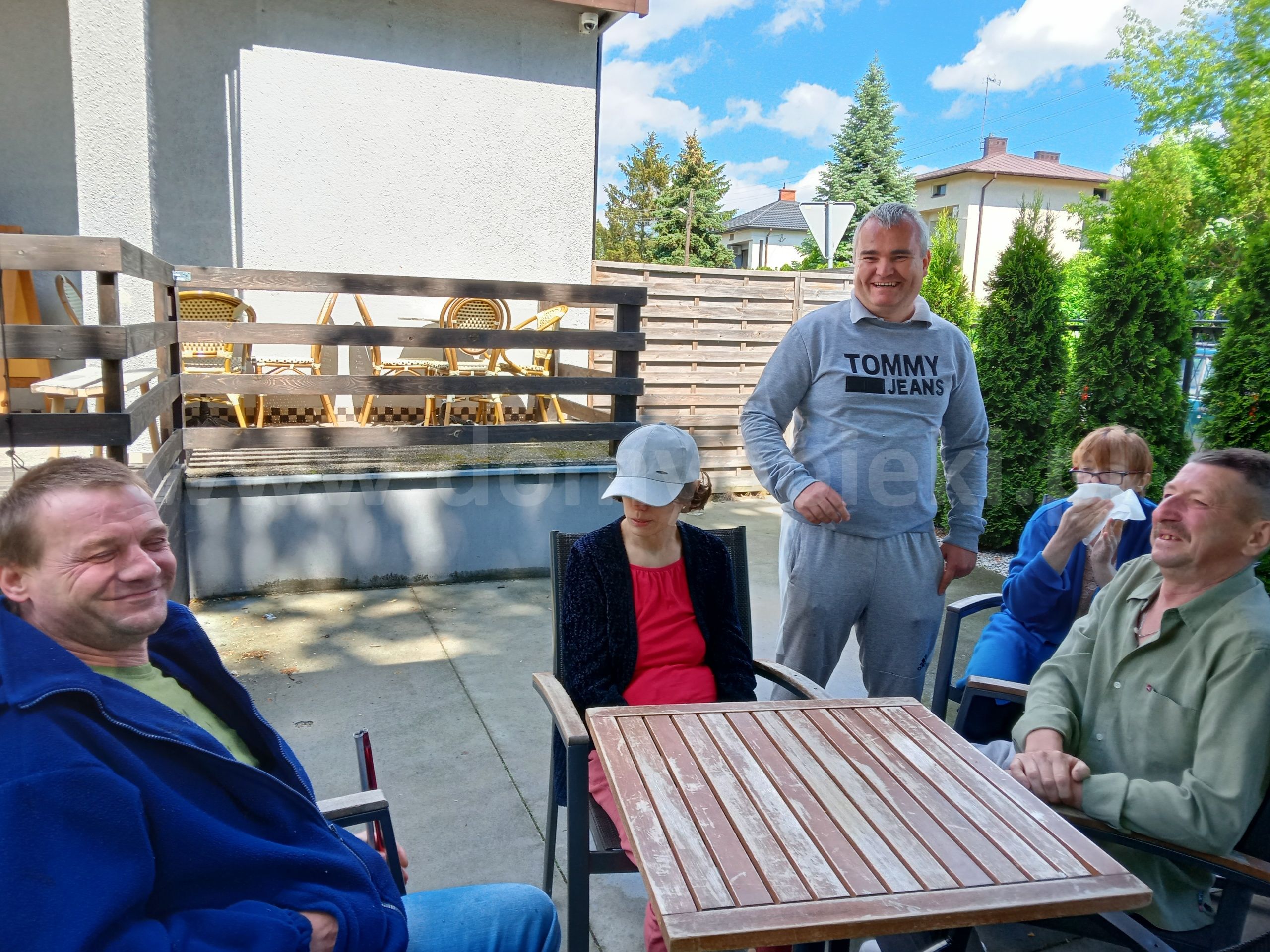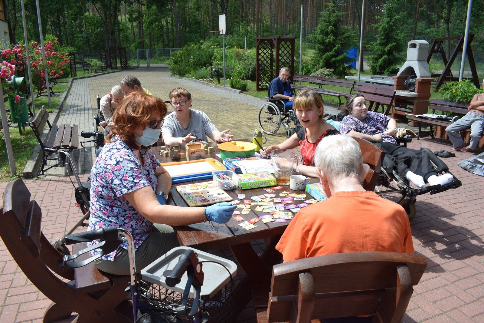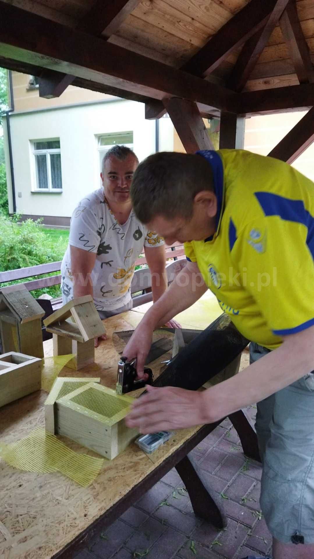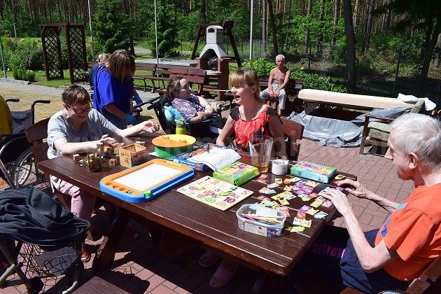 Mieszkańcy w celu poprawy kondycji pod okiem wykwalifikowanych fizjoterapeutów mogą korzystać m. in. z: katedry biczy szkockich, stołu do pionizacji, toru do ćwiczeń oporowych kończyn dolnych, toru do nauki chodzenia, bieżni, aqavibronu, Lampy Sollux, Ugulu, hydromasaży, krioterapii i innych zabiegów rehabilitacyjnych także na świeżym powietrzu - Nordic Walking. Każdy mieszkaniec poddawany jest zabiegom usprawniającym, według zleceń lekarza. Możemy pochwalić się w tym zakresie wieloma sukcesami jakie osiągamy w codziennej pracy. Usprawniliśmy wiele osób po udarach, które poruszały się przy pomocy wózka inwalidzkiego a w chwili obecnej poruszają się o kuli czy przy pomocy chodzika. Nasi podopieczni mają możliwość uczestniczenia w 14 dniowych turnusach rehabilitacyjnych z dofinansowaniem PFRON, PCPR. Celem tych wyjazdów, oprócz podniesienia sprawności fizycznej, jest integracja z innymi mieszkańcami Domów a także zwiedzanie nowych miejsc. Bardzo często organizowane są wycieczki integracyjne do innych placówek bądź wyjazdy połączone ze zwiedzaniem różnych ciekawych miejsc w Polsce. Wszystko to można śledzić w zakładce Aktualności na naszej stronie https://dps.powiatsochaczew.pl/ na którą serdecznie zapraszamy, gdyż w naszym Domu ma miejsce bardzo dużo fajnych wydarzeń. W Domu prowadzona jest wielokierunkowa terapia zajęciowa w następujących pracowniach: krawieckiej, tkackiej, garncarskiej, gastronomicznej, decoupage. Terapeuci pracując z mieszkańcami stosują następujące formy terapii: biblioterapia, muzykoterapia, dramoterapia, choreoterapia, ergoterapia, arteterapia. Mieszkańcy wraz z pracownikami przygotowują spektakle i przedstawienia, które prezentują na regionalnych i ogólnopolskich imprezach kulturalnych, festiwalach, przeglądach twórczości artystycznej. Także teren wokół Domu jest specjalnie zagospodarowany z myślą o spędzaniu tu wolnego czasu przez mieszkańców. Zainstalowane są: huśtawki, altanki, ławeczki, stół do ping - ponga, stół kamienny do gry w szachy, grill ogrodowy, plac kamienny z ławkami i miejscem na ognisko. Na terenie zostały wyznaczone miejsca do uprawy przez mieszkańców warzyw, ziół i kwiatów ozdobnych.