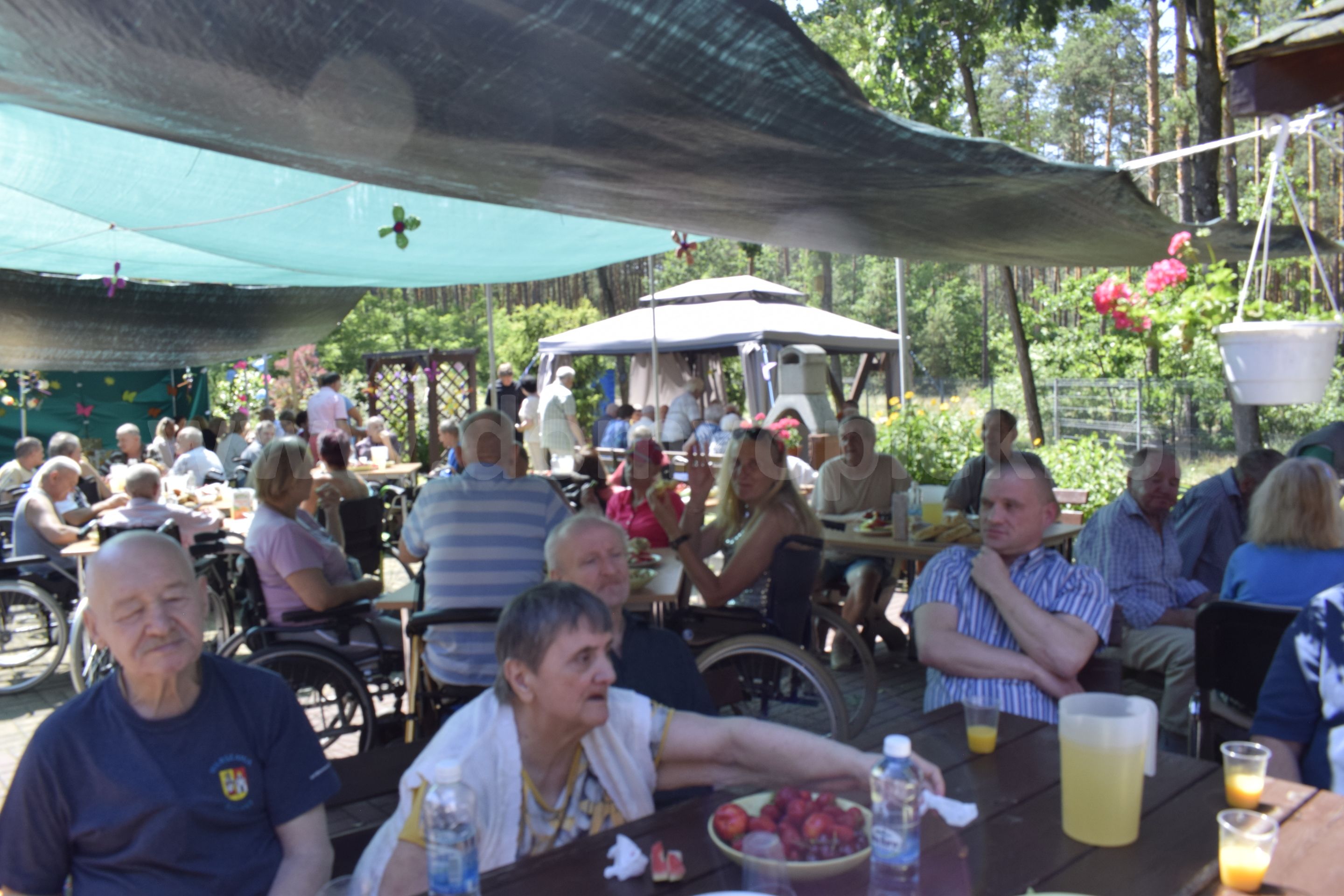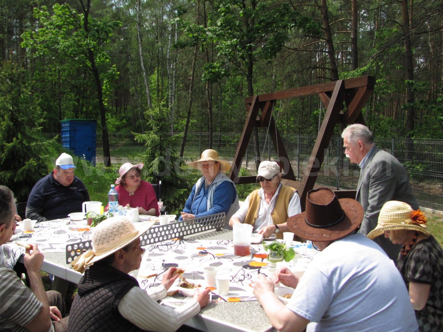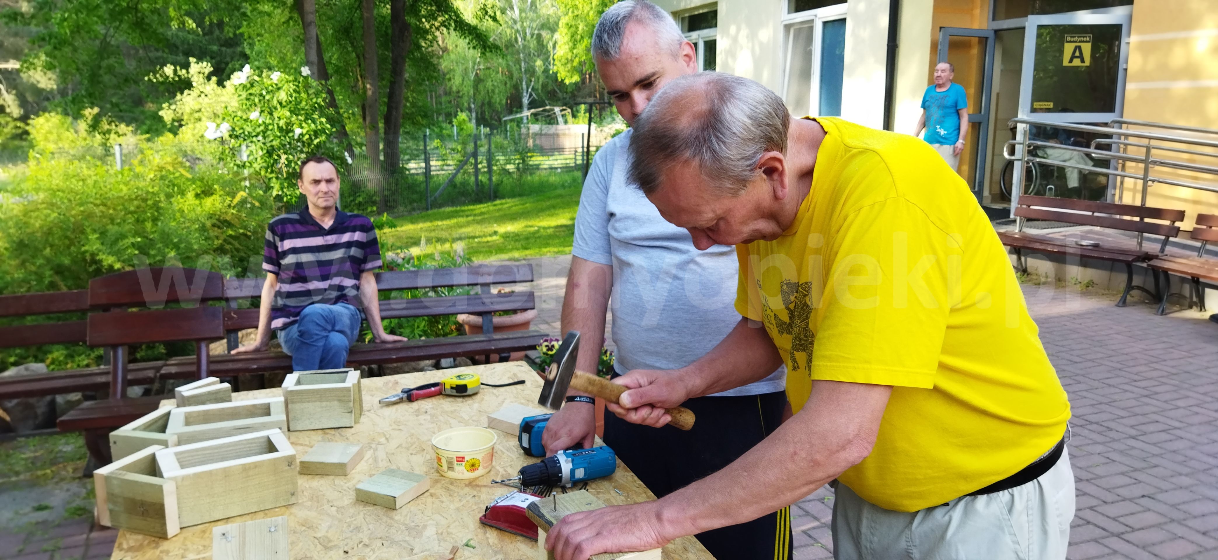 Mieszkańcy w celu poprawy kondycji pod okiem wykwalifikowanych fizjoterapeutów mogą korzystać m. in. z: katedry biczy szkockich, stołu do pionizacji, toru do ćwiczeń oporowych kończyn dolnych, toru do nauki chodzenia, bieżni, aqavibronu, Lampy Sollux, Ugulu, hydromasaży, krioterapii i innych zabiegów rehabilitacyjnych także na świeżym powietrzu - Nordic Walking. Każdy mieszkaniec poddawany jest zabiegom usprawniającym, według zleceń lekarza. Możemy pochwalić się w tym zakresie wieloma sukcesami jakie osiągamy w codziennej pracy. Usprawniliśmy wiele osób po udarach, które poruszały się przy pomocy wózka inwalidzkiego a w chwili obecnej poruszają się o kuli czy przy pomocy chodzika. Nasi podopieczni mają możliwość uczestniczenia w 14 dniowych turnusach rehabilitacyjnych z dofinansowaniem PFRON, PCPR. Celem tych wyjazdów, oprócz podniesienia sprawności fizycznej, jest integracja z innymi mieszkańcami Domów a także zwiedzanie nowych miejsc. Bardzo często organizowane są wycieczki integracyjne do innych placówek bądź wyjazdy połączone ze zwiedzaniem różnych ciekawych miejsc w Polsce. Wszystko to można śledzić w zakładce Aktualności na naszej stronie https://dps.powiatsochaczew.pl/ na którą serdecznie zapraszamy, gdyż w naszym Domu ma miejsce bardzo dużo fajnych wydarzeń. W Domu prowadzona jest wielokierunkowa terapia zajęciowa w następujących pracowniach: krawieckiej, tkackiej, garncarskiej, gastronomicznej, decoupage. Terapeuci pracując z mieszkańcami stosują następujące formy terapii: biblioterapia, muzykoterapia, dramoterapia, choreoterapia, ergoterapia, arteterapia. Mieszkańcy wraz z pracownikami przygotowują spektakle i przedstawienia, które prezentują na regionalnych i ogólnopolskich imprezach kulturalnych, festiwalach, przeglądach twórczości artystycznej. Także teren wokół Domu jest specjalnie zagospodarowany z myślą o spędzaniu tu wolnego czasu przez mieszkańców. Zainstalowane są: huśtawki, altanki, ławeczki, stół do ping - ponga, stół kamienny do gry w szachy, grill ogrodowy, plac kamienny z ławkami i miejscem na ognisko. Na terenie zostały wyznaczone miejsca do uprawy przez mieszkańców warzyw, ziół i kwiatów ozdobnych.