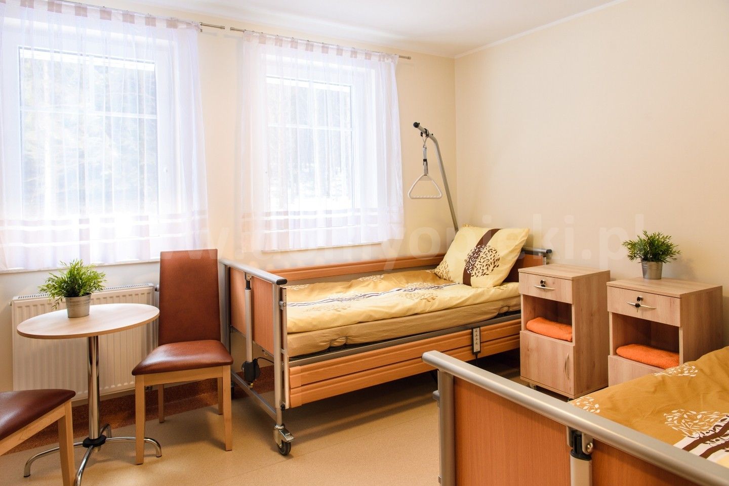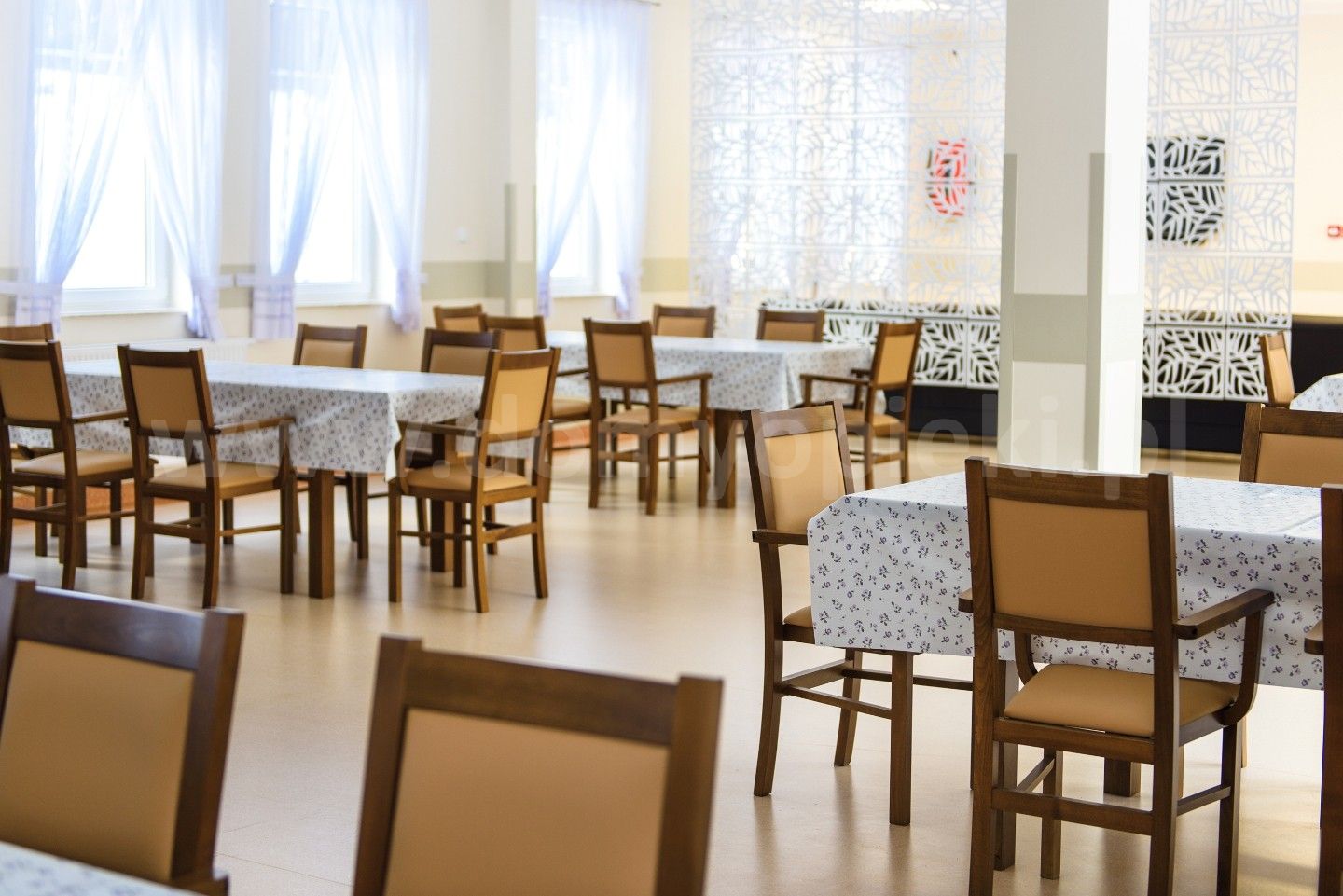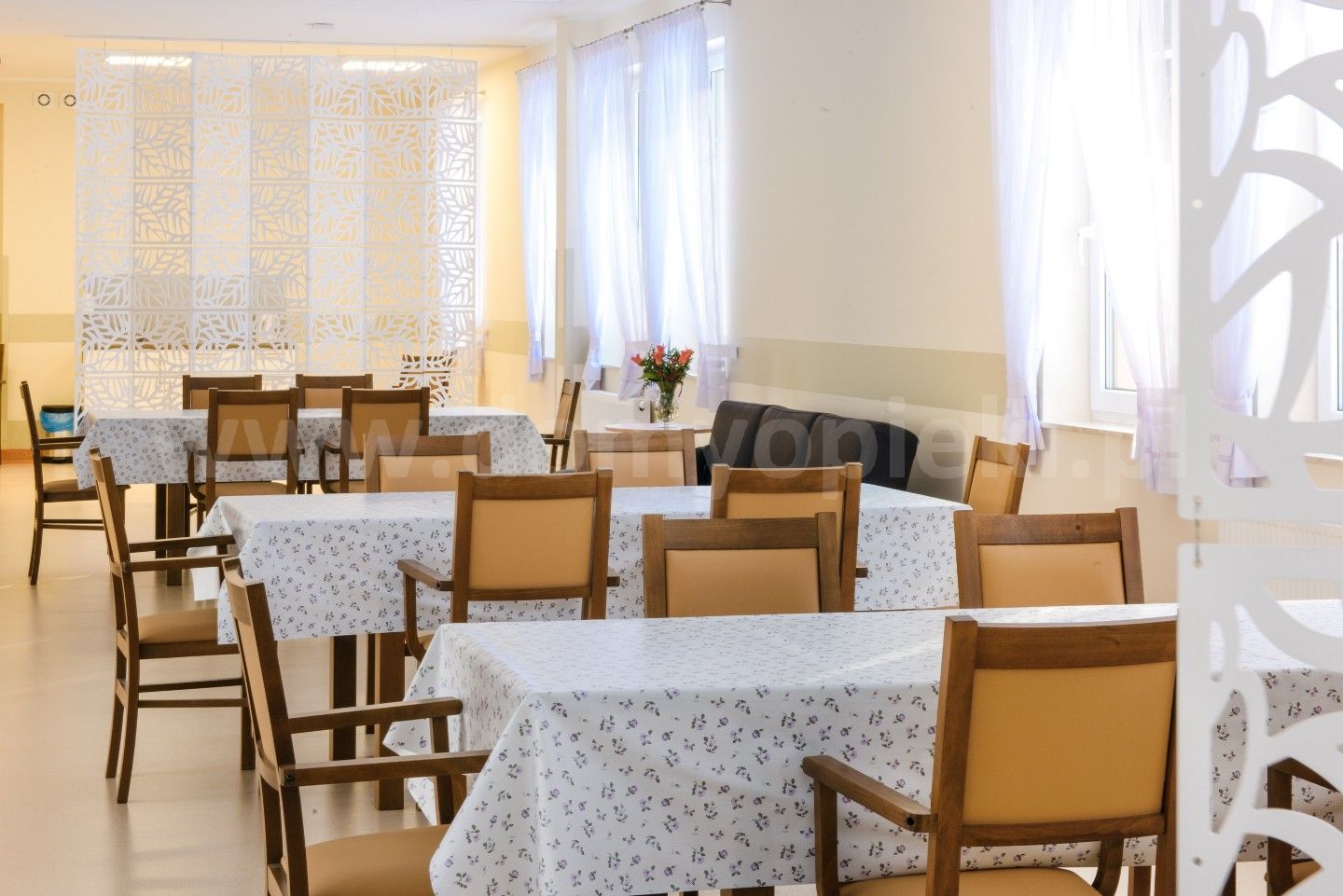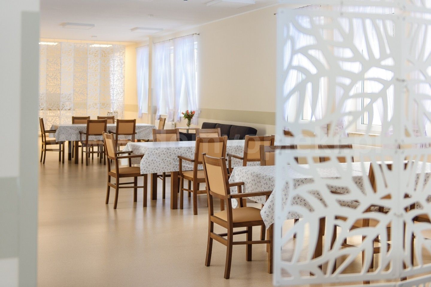 Udogodnienia: własna kuchnia i pięć posiłków dziennie (diety uwzględnione), pomoc w codziennych czynnościach, pranie i sprzątanie, terapia zajęciowa, opieka duszpasterska