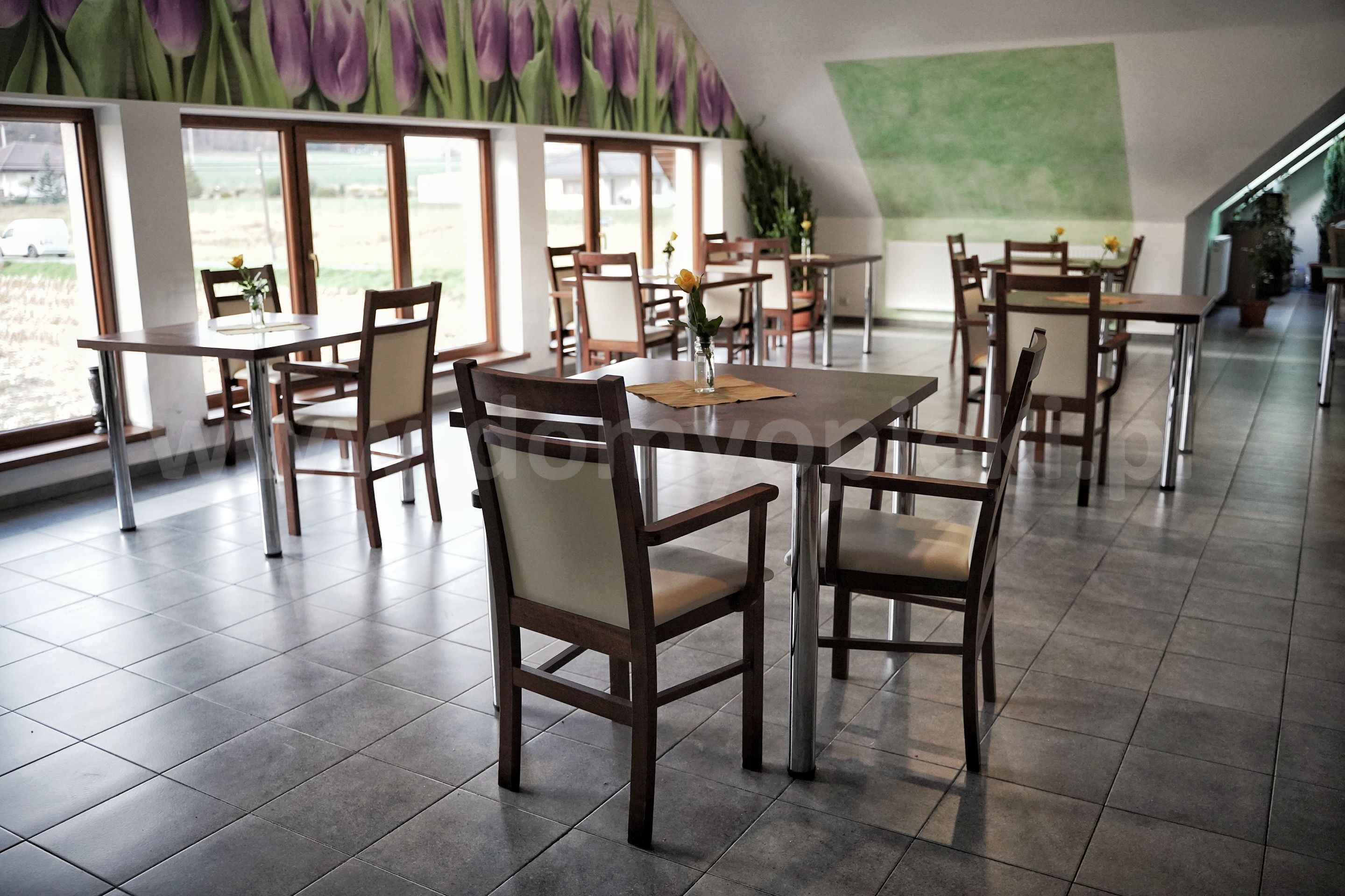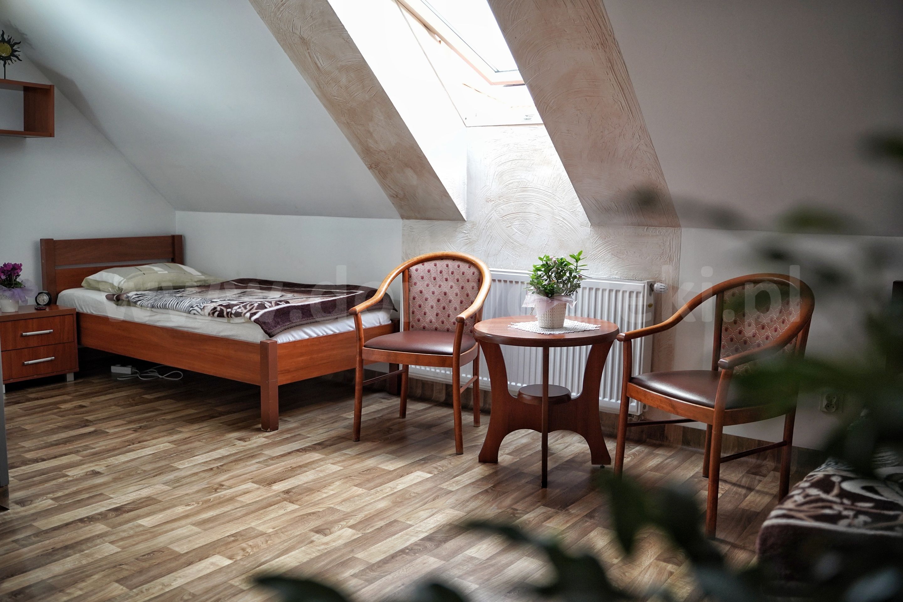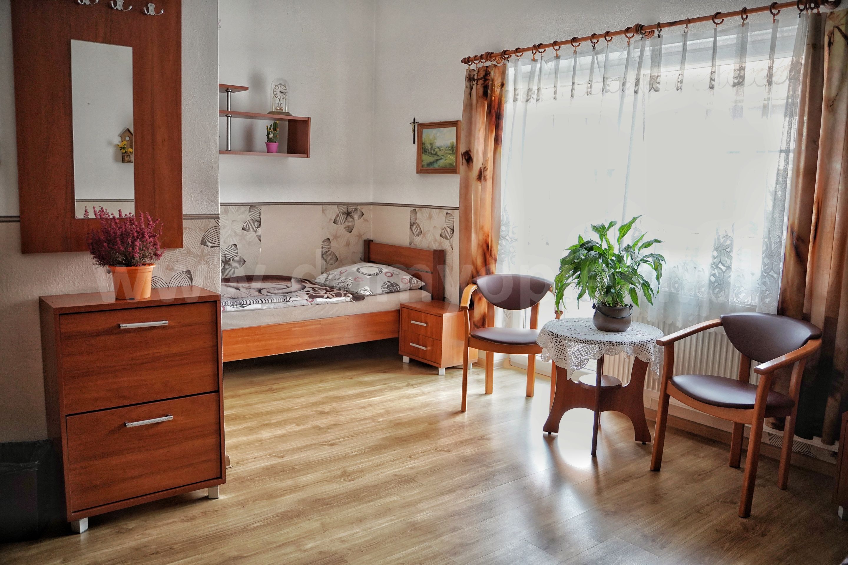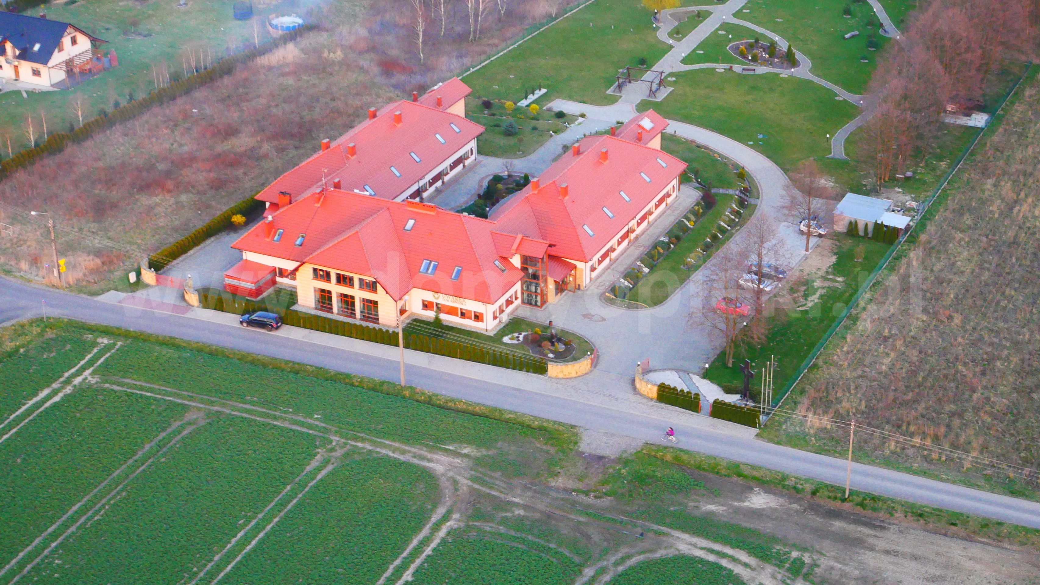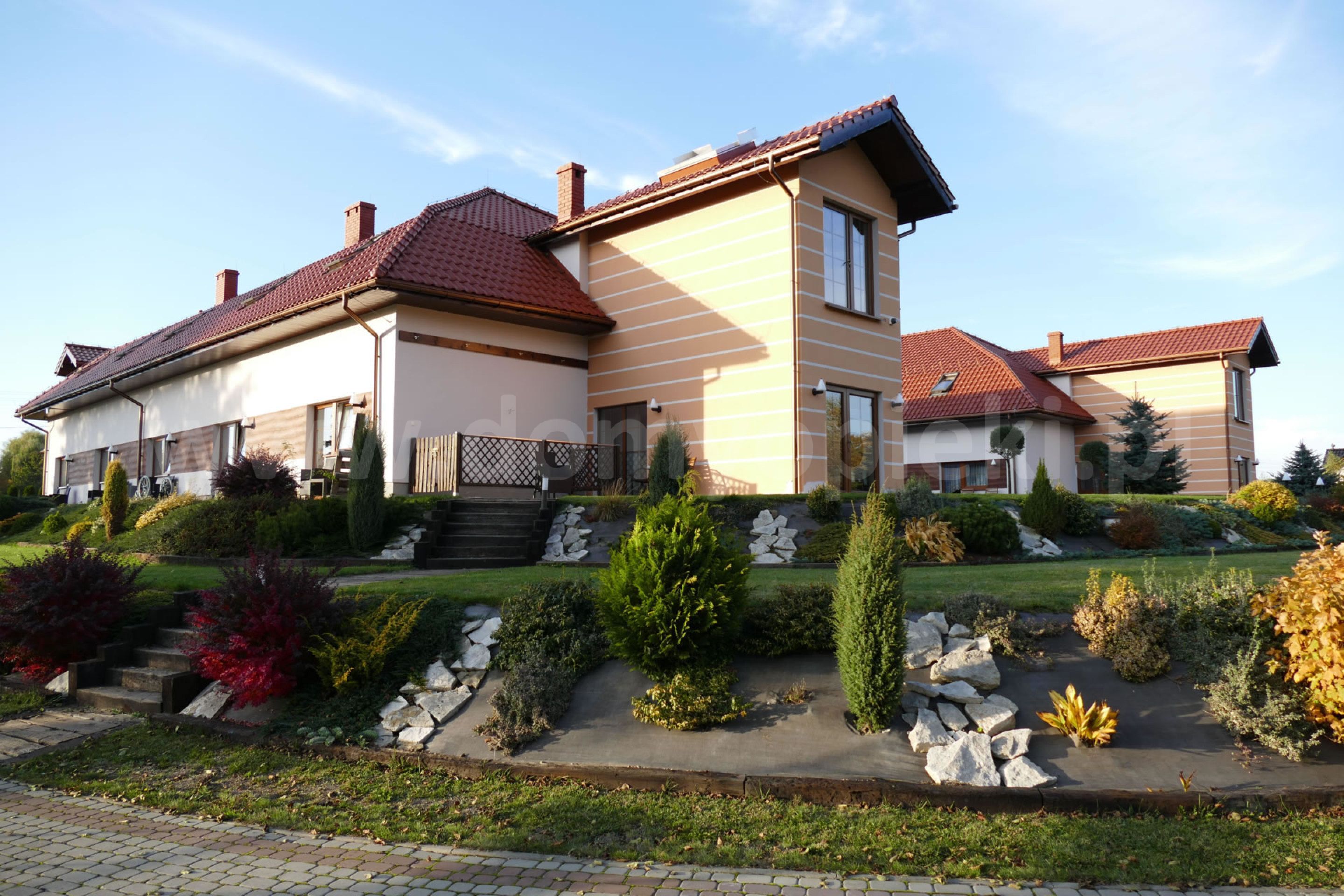 Udogodnienia: pokoje 1-, 2-, 3-osobowe z łazienką i przywoławczą instalacją, TV, telefon, ogród, usługi pralnicze, krawieckie i fryzjerskie