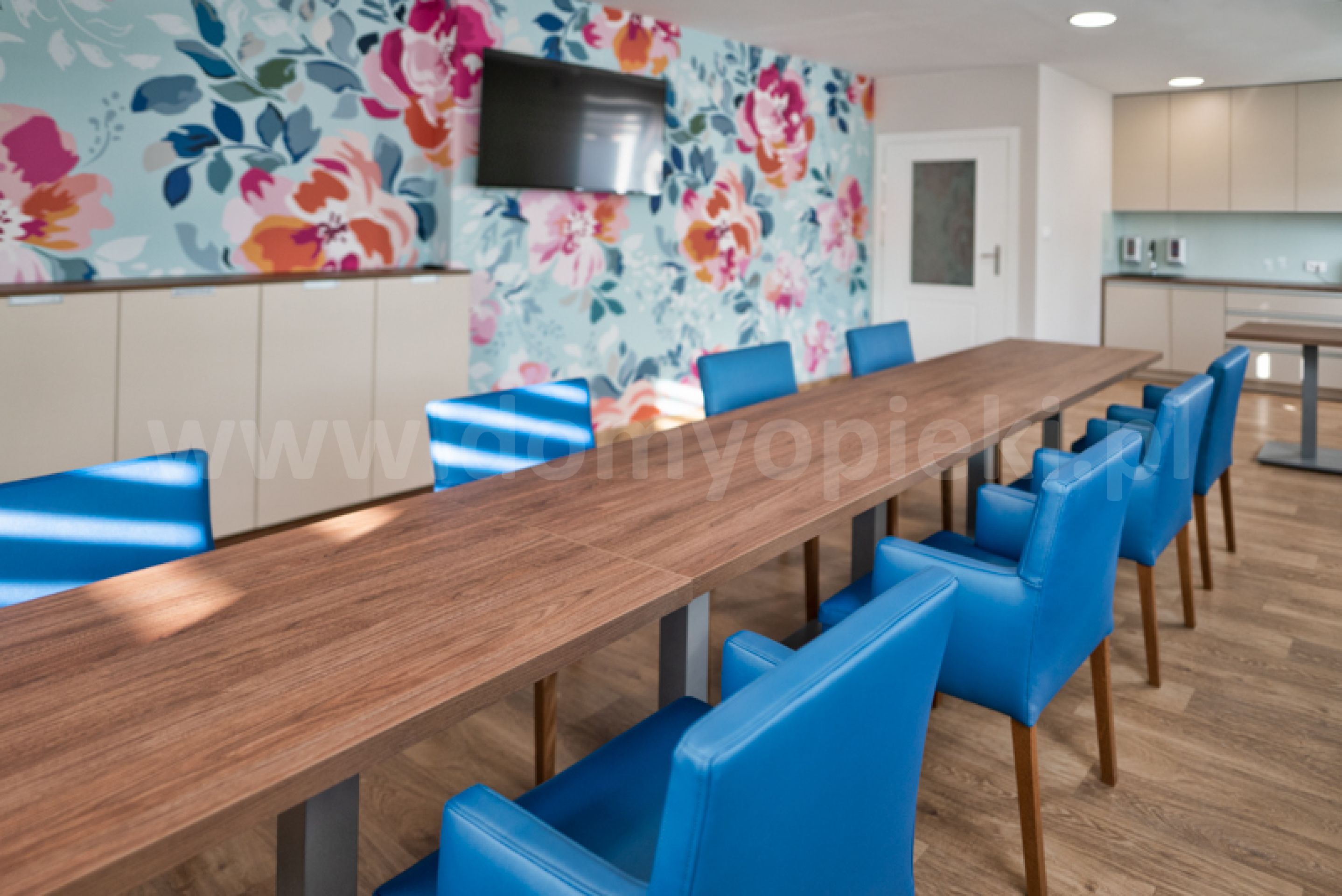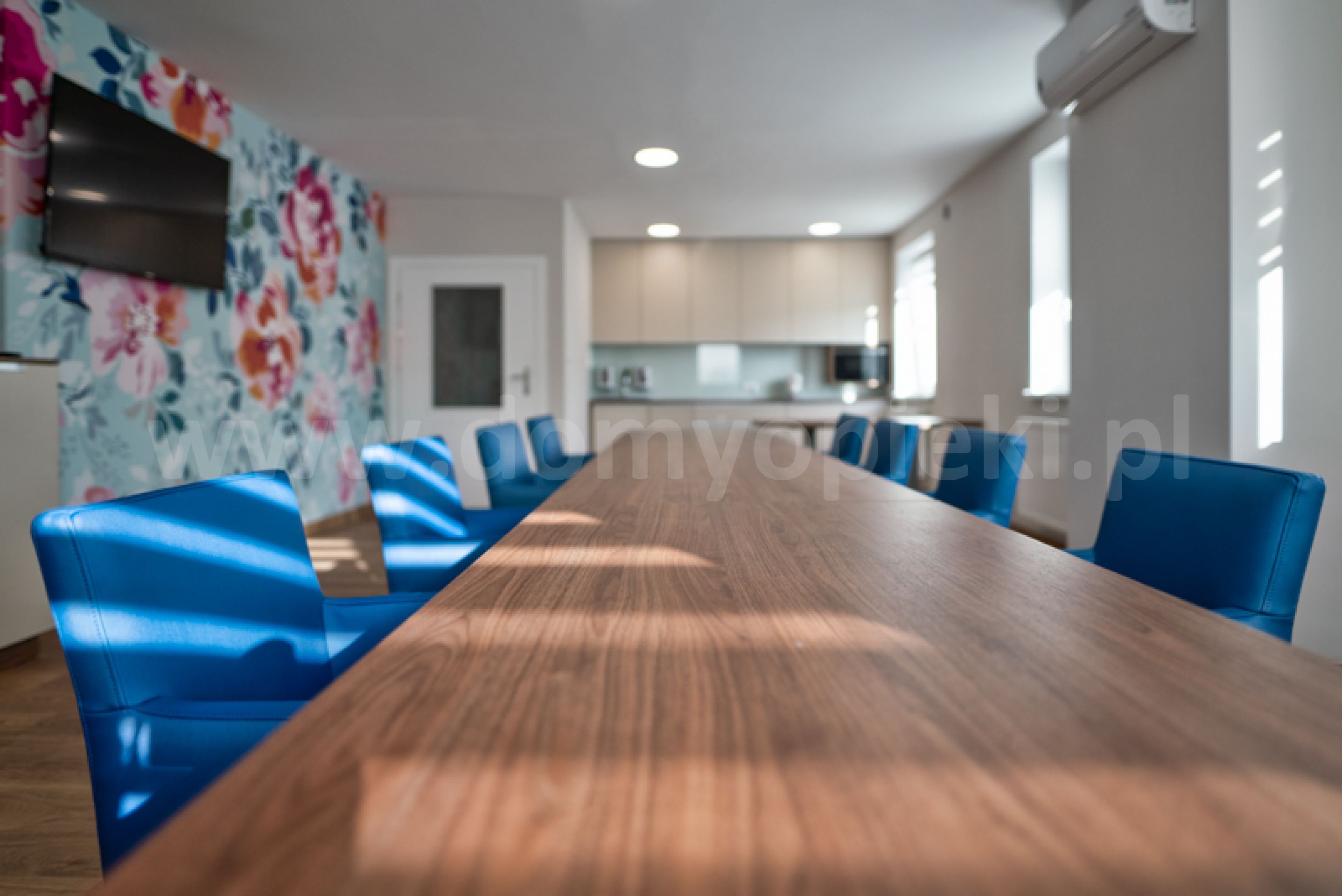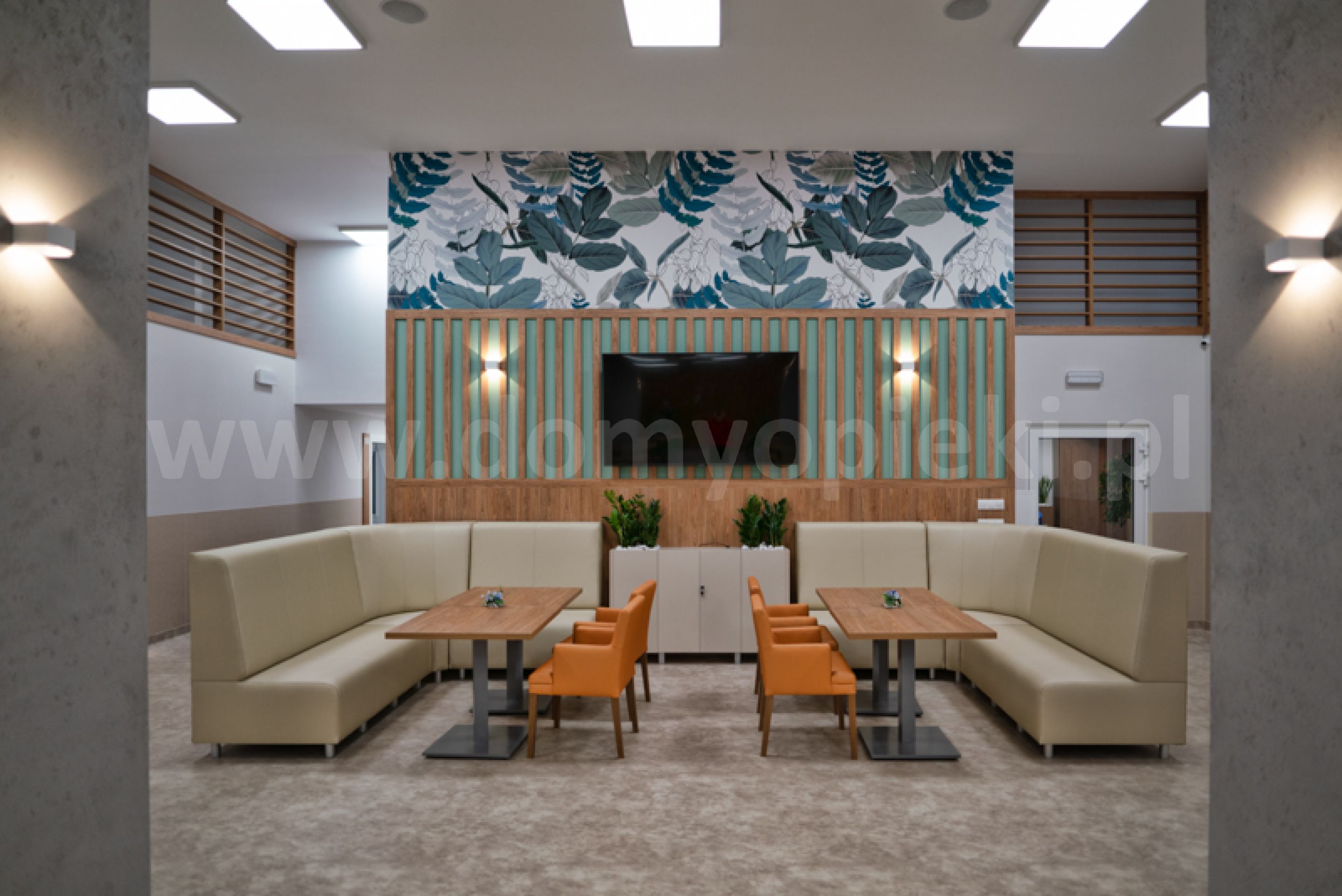 Oprócz pokoi własnych nasz ośrodek dysponuje przestrzennymi pomieszczeniami wspólnymi. Centrum życia stanowi sala do spędzania wolnego czasu, tutaj również odbywa się terapia zajęciowa. Sala pobytu dziennego to przyjazna przestrzeń do wspólnego przebywania, seniorzy mogą tu miło spędzać czas na rozmowach, wspólnym oglądaniu telewizji oraz kreatywnie działać współpracując z naszym personelem. Tutaj staramy się organizować różne formy aktywności intelektualnej oraz zajęć terapeutycznych motywując swoich mieszkańców do rozwijania swoich zainteresowań i działań twórczych. Salę te wykorzystujemy również przy organizacji uroczystości, spotkań z udziałem rodzin i przyjaciół oraz imprez kulturalnych.