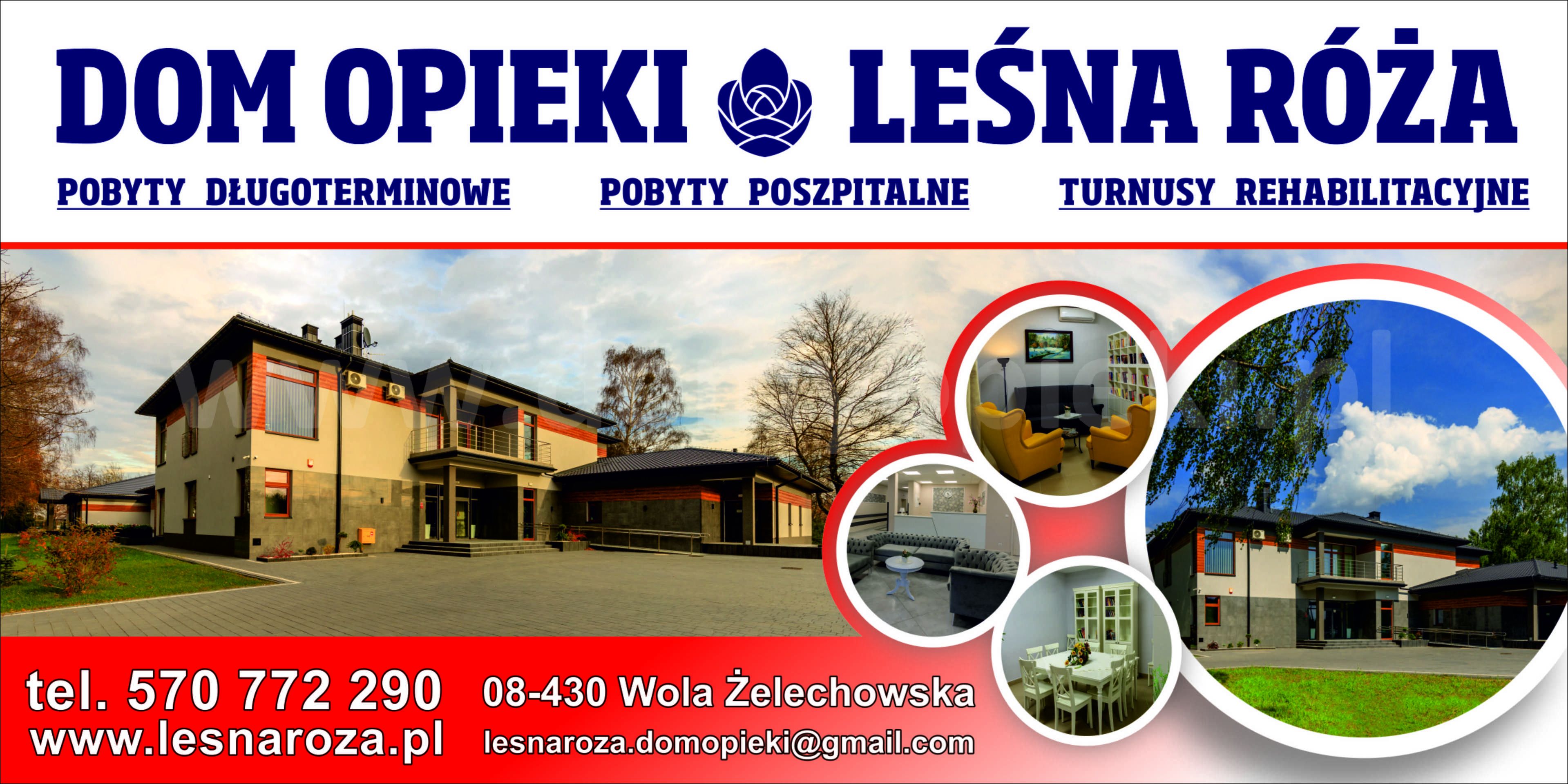 Dom Opieki Leśna Róża to placówka opiekuńcza zlokalizowana w Woli Żelechowskiej, około 80 km od Warszawy, w spokojnej okolicy blisko lasu. Obiekt został przygotowany z myślą o osobach starszych i osobach z ograniczeniami ruchowymi — bez barier architektonicznych, wyposażony w windę oraz system przywoławczy. Dostępne są pokoje jedno-, dwu- i trzyosobowe z łazienkami, TV i dostępem do Wi‑Fi.