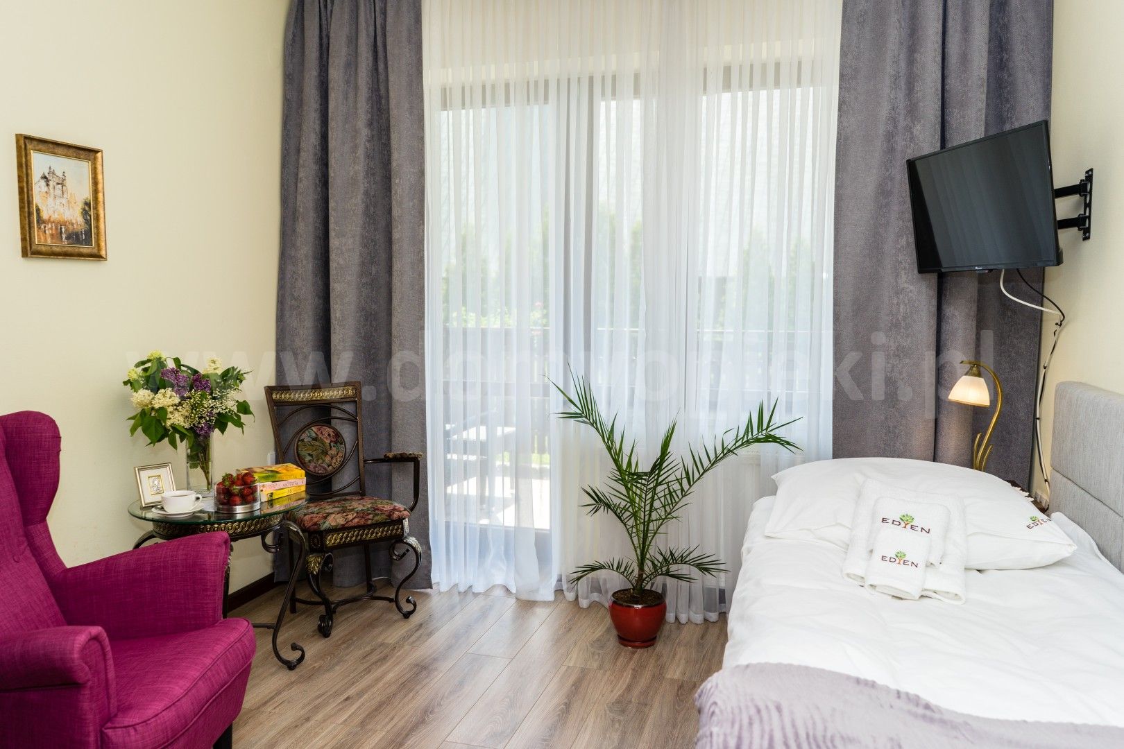 Pensjonat Seniora Eden jest obiektem o wysokim standardzie, zaprojektowanym dla wygody oraz komfortu osób w nim zamieszkujących. Dysponujemy apartamentami, pokojami jedno, dwu i trzyosobowymi. Każdy z nich jest wyposażony w łazienkę przystosowaną do potrzeb osób starszych, telewizor oraz dostęp do Internetu. Część pokoi posiada tarasy oraz balkony wraz z meblami wypoczynkowymi. Dla osób niepełnosprawnych, poruszających się na wózkach inwalidzkich zapewniamy dostęp do specjalnie wyposażonych łazienek. Aby móc zapewnić poczucie bezpieczeństwa mieszkańcom, dysponujemy w naszym budynku systemem przywołującym. Dzięki temu rozwiązaniu każdy domownik w razie potrzeby może przywołać osoby, które się nimi opiekują. Nowoczesna windy i brak barier architektonicznych ułatwiają poruszanie się po obiekcie.
